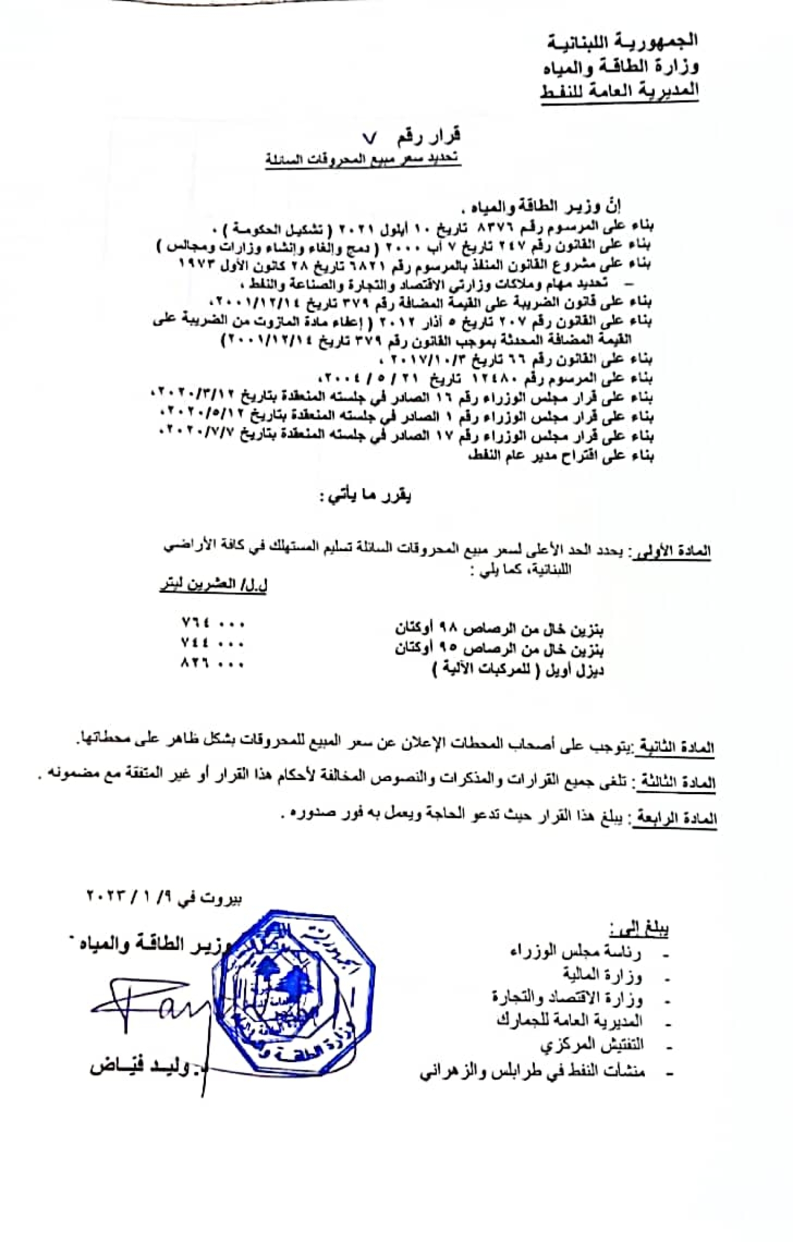 أصدرت وزارة الطاقة والمياه جدولاً جديداً لاسعار المحروقات حيث إرتفع اليوم، سعر صفيحة البنزين 98 أوكتان 32,000 و95 أوكتان 31,000 ليرة والمازوت 34,000 ليرة والغاز 19,000 ليرة.